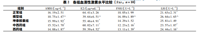 給予雷公藤多苷片的 55 只大鼠呈現(xiàn)不同 程度的動(dòng)情周期紊亂,表現(xiàn)為延長(zhǎng)與停滯。連續(xù)灌胃 2 周 后,46 只大鼠出現(xiàn)連續(xù)動(dòng)情周期紊亂,造 模 成 功 率 為 83. 6%; 2 周治療結(jié)束后,陰道脫落細(xì)胞涂片顯示 28 只大 鼠動(dòng)情周期恢復(fù) ( 28 /46,60. 9%) ,其中模型組 3 只 ( 3 / 11,27. 3%) ,西藥組 8 只 ( 8 /11,72. 7%) ,坤泰膠囊組 8 只 ( 8 /12,66. 7%) ,中西藥組 9 只 ( 9 /12,75%) 。與正常組比較,模型組 血清 AMH、E2 水 平 顯 著 降 低,LH、FSH 水 平 顯 著 升 高 ( P<0. 05) ; 與模型組比較,坤泰膠囊組、中西藥組、西藥 組 AMH、E2 水平顯著升高 ( P<0. 05) ,中西藥組、西藥組 FSH、LH 水平顯著降低 ( P<0. 05) 。