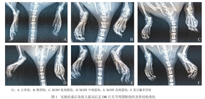 由圖 1 可見,正常組:大鼠雙踝關(guān)節(jié)周圍軟組織 無腫脹,無骨質(zhì)疏松、骨質(zhì)破壞。模型組:大鼠雙踝 關(guān)節(jié)周圍軟組織腫脹明顯,右踝較重,雙踝及跖趾關(guān) 節(jié)關(guān)節(jié)間隙不清,部分關(guān)節(jié)融合。XCHT 低劑量組: 大鼠雙踝關(guān)節(jié)周圍軟組織腫脹明顯,右踝較重,雙踝 及跖趾關(guān)節(jié)關(guān)節(jié)間隙不清,部分關(guān)節(jié)融合。XCHT 中劑量組:大鼠雙踝關(guān)節(jié)周圍軟組織腫脹明顯,右踝較 重,雙踝及跖趾關(guān)節(jié)關(guān)節(jié)間隙不清,部分關(guān)節(jié)融合。 XCHT 高劑量組:大鼠雙踝關(guān)節(jié)周圍軟組織腫脹明顯, 右踝較重;右踝及跖趾關(guān)節(jié)關(guān)節(jié)間隙不清,部分關(guān)節(jié) 融合,但較中劑量組及低劑量組程度輕;左踝及跖趾 關(guān)節(jié)關(guān)節(jié)間隙尚清,關(guān)節(jié)無融合。雷公藤多苷組:大鼠雙踝關(guān)節(jié)周圍軟組織腫脹明顯,右踝較重;右踝及 跖趾關(guān)節(jié)關(guān)節(jié)間隙不清,部分關(guān)節(jié)融合,但較中劑量 組及低劑量組程度輕,與高劑量組相似;左踝及跖趾 關(guān)節(jié)關(guān)節(jié)間隙尚清,關(guān)節(jié)無融合。