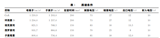 色譜條件:采用 UltimateXB- C18色譜柱(4.6mm×50mm,5μm),柱溫65 ℃;流 速:0.8mL/min;流動相:2mmoL/L 乙酸銨-0.1%甲 酸水溶液(B)-0.1%甲酸甲醇溶液(A),進樣量5μL; 洗脫方式:梯度洗脫,其中0.01~0.1minA 相水平從 50%~100%,保持0.9min,1.0~1.1minA 相水平從 100%~50%,保持1.9 min。質譜 條 件:電 噴 霧 電 離 源(ESI);離子極性:正離子模式;監測模式為 MRM;離 子噴射電壓:5000V;溫度:325 ℃;噴霧氣(GS1):65; 輔助加熱氣(GS2):55;氣簾氣(Curtaingas):20;碰撞氣 壓力:Medium;用于定量分析離子分別為:CsA 質荷比 (m/z)1219.900~1203.100,環 孢 素 D m/z1234. 000~1217.000,他克莫司 m/z821.5~768.5,西羅莫 司 m/z931.7~864.6,子囊霉素 m/z809.4~756.4;各 種質譜條件參數如表1。