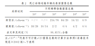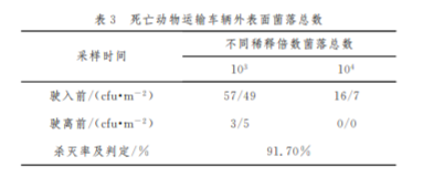 本報告選取1輛死亡動物運輸車輛監(jiān)測細菌殺 滅情 況,結(jié)果表明該車 輛內(nèi)表面細菌殺滅率 ≥ 90%,具體見表2、表3。