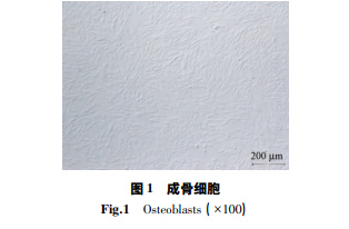 無菌條件下取出出生 72 h 的 SD 乳鼠頭骨,置 入 4°C 的 PBS 溶液中,然后應(yīng)用眼科鑷與手術(shù)刀剔 除表面的結(jié)締組織,用 4°C 的 PBS 溶液反復(fù)吹打清 洗組織并將其剪成小于 1 mm3 的組織塊,將剪好的 組織塊轉(zhuǎn)移到 1. 5 mL 離心管中,加 3 倍體積的胰 酶,將離心管置入 37 ℃ 的脫色搖床(TS-1000型)中進(jìn)行消化,振 蕩消化 20 min 后加入胎牛血清終止消化,放置于 4 ℃ 冰 箱 中 靜 置 5 min,舍 棄 上 清 液,加 入 0. 2% Collagenase I,置于 37 ℃的脫色搖床中,消化并振蕩 60 min 后用胎牛血清終止消化,多次吹打后通過 200 目濾網(wǎng)過濾去除碎片,收集濾液,1 200 r /min 離心 8 min,棄上清液,用 DMEM 完全培養(yǎng)基進(jìn)行重 新懸浮細(xì)胞,置于 37 ℃,5% CO2 培養(yǎng)箱中進(jìn)行培 養(yǎng); 2 d 后換液,之后間隔 2 ~ 3 d 換 1 次培養(yǎng)液。并在倒置顯微鏡下觀察細(xì)胞形態(tài)及生長情況,取培養(yǎng) 的第三代成骨細(xì)胞進(jìn)行后續(xù)實(shí)驗(yàn)。