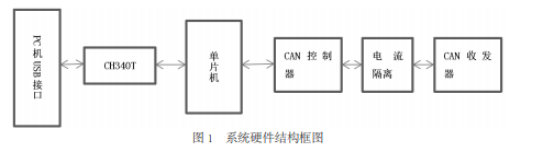 (三)系統(tǒng)硬件結(jié)構(gòu) 本文設(shè)計(jì)的 CAN/USB 轉(zhuǎn)接器以 51 單片 機(jī)為核心。由單片機(jī)負(fù)責(zé)接收其中一個(gè)總線 上的信號(hào),并將其轉(zhuǎn)發(fā)到另一個(gè)總線上,同 時(shí)也由單片機(jī)負(fù)責(zé)對(duì)來(lái)不及發(fā)送的數(shù)據(jù)進(jìn)行 緩存。前者要求單片機(jī)有足夠快的處理速度, 后者則要求單片機(jī)有盡可能大的 RAM 空間。 51 單片機(jī)既沒(méi)有對(duì) CAN 總線的支持,也沒(méi) 有對(duì) USB 總線的支持,因此這兩種總線都需 要用專門(mén)接口額外連接相應(yīng)的轉(zhuǎn)接芯片。常 見(jiàn)的 USB 轉(zhuǎn)接芯片是 CH340 系列,它可以將 USB 接口和 UART 串口的數(shù)據(jù)進(jìn)行轉(zhuǎn)換。而 CAN 總線的硬件部分通常由處理器、CAN 控 制器和 CAN 收發(fā)器三部分構(gòu)成。這里讓單片 機(jī)通過(guò) UART 接口連接 USB 轉(zhuǎn)串口芯片;通 過(guò) P0 和 P2 兩個(gè)擴(kuò)展存儲(chǔ)器接口連接 CAN 控 制器,CAN 控制器通過(guò)光耦合器與 CAN 收發(fā)器連接以實(shí)現(xiàn)信號(hào)隔離,避免干擾。硬件框 圖如下圖 1。